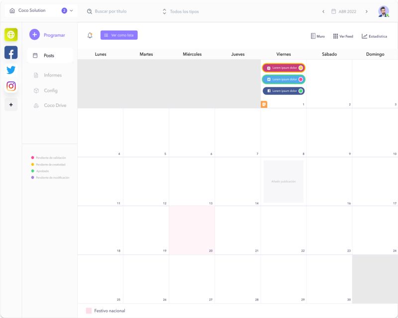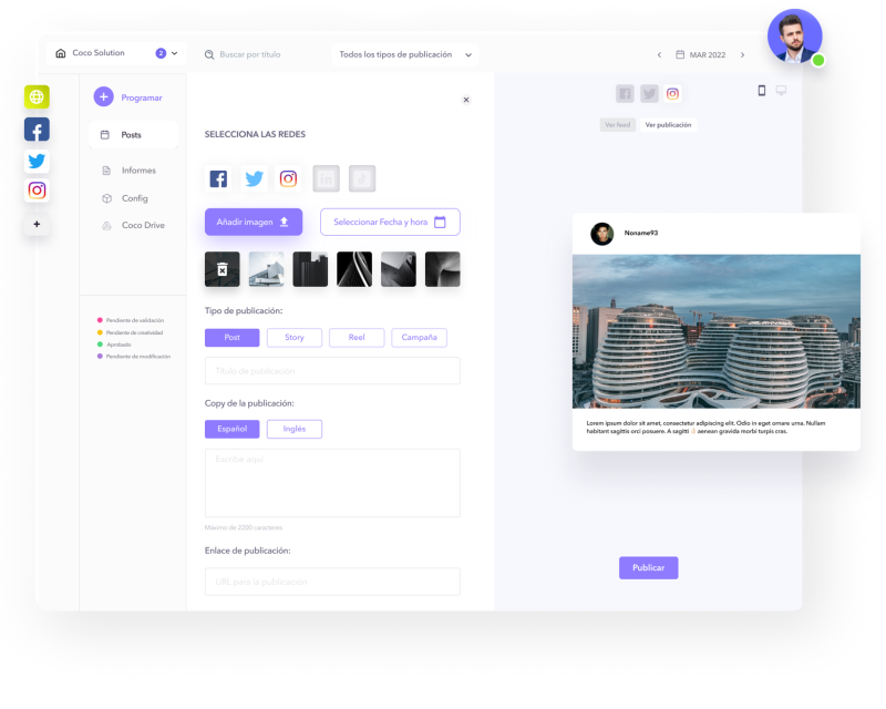 Gestiona e implementa toda tu estrategia de redes sociales desde LIME. Centraliza todas las acciones en tu panel de acción mensual y controla todo el contenido que vas a publicar en cada perfil con un solo click.